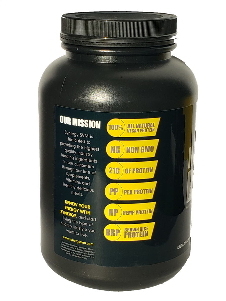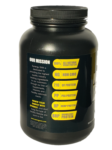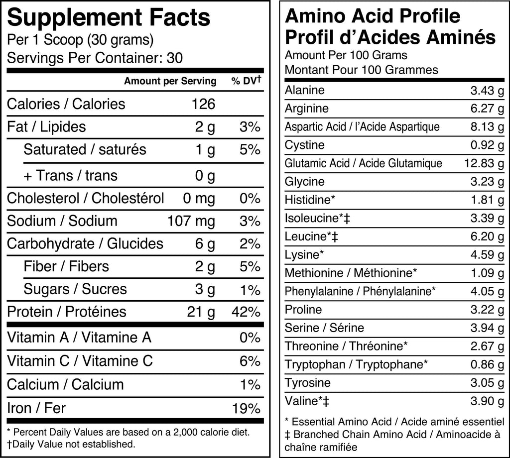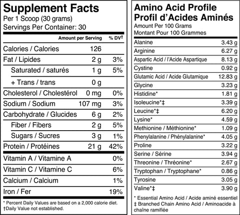 INGREDIENTS: Non-GMO Pea Protein Isolate, Organic Brown Rice Protein, Hemp Protein, Natural Flavours, Xanthan Gum, Stevia, Sea Salt